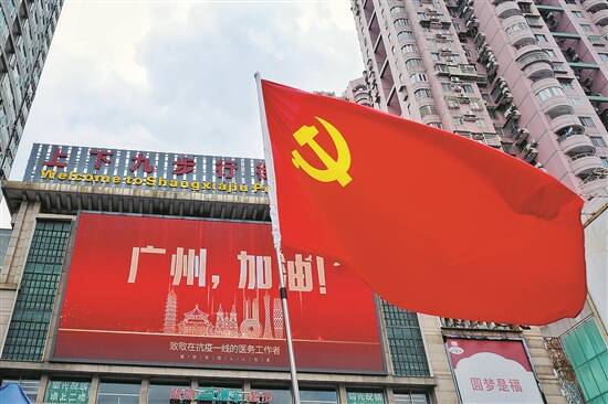 党旗在广州华林街上下九步行街的核酸检测采样点上空迎风飘扬 羊城晚报记者 陈秋明 摄 |