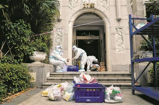 在番禺区锦绣半岛东区17栋门口,物业工作人员全副武装运送生活物资 羊城晚报记者 汤铭明 摄 |