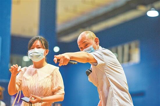 海珠体育中心,64岁陈伯(右)在自己测完核酸后,主动在现场帮助工作人员维持秩序 羊城晚报记者 宋金峪 摄 |