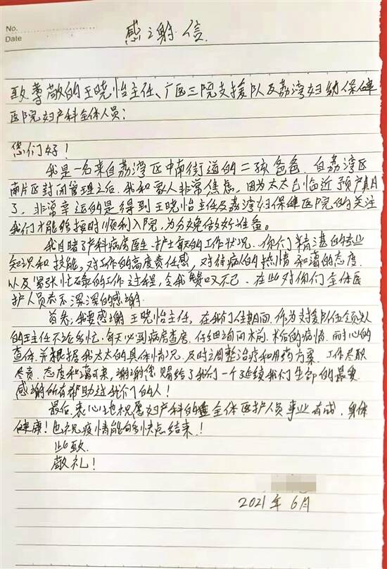 文/图 羊城晚报记者 余燕红 通讯员 白恬 “我目睹了产科病房医生、护士每天的工作状况,你们精湛的专业知识和技能,对工作的高度责任感,对待病人的热情和蔼的态度,以及紧张忙碌的工作过程,令我赞叹不已。再次,对你们全体医护人员表示深深的感谢。” 6月20日,在荔湾妇幼支援的广州医科大学附属第三医院产科副主任医师王晓怡收到一封感谢信。写信的何先生,其太太陈女士(化名)是一位患有先心病、做过心脏手术的二胎高危孕产妇。由于疫情影响,家住中南街的陈女士临近分娩十分焦虑,得知广医三院产科医疗队驻点荔湾妇幼支援,陈女士找到王晓怡,在王晓怡以及大后方广州重症孕产妇救治中心的指导下,陈女士顺利分娩。即将出院时,陈女士的先生写下感谢信感谢医者。 “王主任,幸好有你们,我太太才能平安分娩。”6月17日,陈女士在荔湾妇幼保健顺利剖宫产下自己第二个孩子,陈女士的先生对王晓怡医生满是感谢地说道。 陈女士曾在体检时发现有先天性心脏病,并于2014年做过心脏手术,怀孕分娩对陈女士来说是一件充满风险的事情。2017年,陈女士顺利剖宫产下一个孩子,2020年,陈女士又一次怀孕了。孕期陈女士在广州医科大学附属第三医院广州重症孕产妇救治中心定期产检。但6月3日,孕36周时,陈女士居住的中南街实施封控管理。 二胎、疤痕妊娠、做过心脏手术,陈女士知道自己这一胎合并多个妊娠高危因素,因此,小区实施封闭管理后,陈女士和家人都非常焦虑。6月4日,广医三院产科医疗队驻点荔湾妇幼支援,得知这一消息的陈女士,马上联系社区的三人小组,主动找到王晓怡主任。 “产妇找到我的时候确实非常焦虑,考虑到她做过心脏手术,又是疤痕子宫、还合并有妊娠期糖尿病,属于严重高危的孕产妇,所以我们也是第一时间和‘大后方’进行了远程多学科会诊。”王晓怡介绍。在远程会诊中,广州重症孕产妇救治中心主任陈敦金教授得知这个患者情况,也是高度重视,亲自指导为患者制定了围分娩期管理方案,包括手术计划、术前术后监测计划及应急预案。 做好了充分的术前准备,6月17日,在家属的同意下,王晓怡在荔湾妇幼为孕38周的陈女士实施了剖宫产手术。手术中,王晓怡团队严密监测生命体征,手术进展非常顺利,陈女士平安生下一个男宝宝,并于6月20日顺利出院。 出院时,何先生特意写下一封感谢信感谢王晓怡主任团队。“收到感谢信,我很感动,在疫情期间大家都不容易,能感受得到患者真心的感谢,再辛苦我也觉得值得。”王晓怡说道。