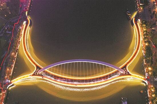 夜幕下的广州首座跨珠江人行桥流光溢彩,身姿优美 羊城晚报记者 宋金峪 摄 |