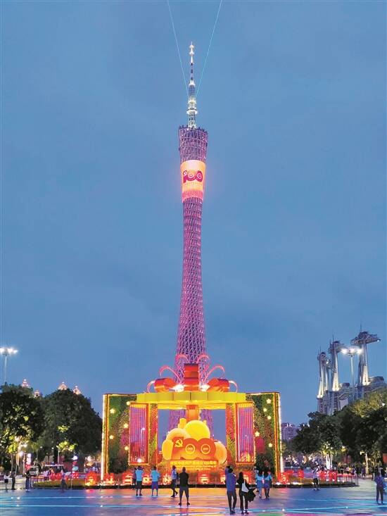 昨晚,广州“七一”主题灯光秀正式联动亮灯,广州塔和大型立体花坛“三面礼物盒”在五彩斑斓光影中熠熠生辉 羊城晚报记者 宋金峪 摄 |