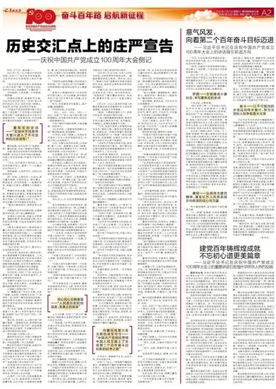 “今天,中华民族向世界展现的是一派欣欣向荣的气象,正以不可阻挡的步伐迈向伟大复兴。” “现在,中国共产党团结带领中国人民又踏上了实现第二个百年奋斗目标新的赶考之路。” 2021年7月1日,