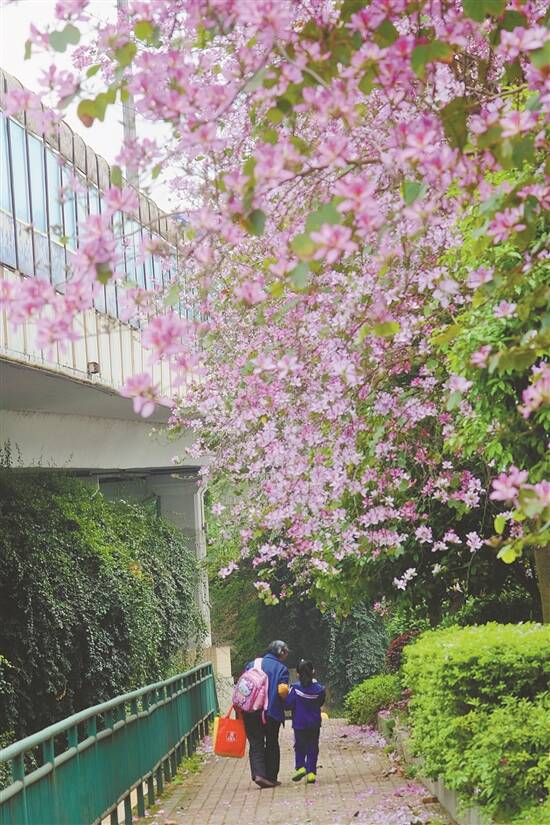 □图\文 张玉清 广西柳州,一位年迈的奶奶和她的孙女走在回家路上。奶奶肩上帮孙女背着沉重书包,一手提着装满东西的袋子,一手牵着孙女的手……路上开满鲜花。 “随手拍”专用稿箱:ycwbwyb@163.com