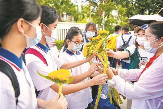 广州中考今天上午结束。在华师附中考点门口,暨大附中一老师为走出考场的学生每人送上一朵向日葵,祝他们“一举夺魁” 羊城晚报记者 梁喻 林桂炎 实习生 方宁 摄 |