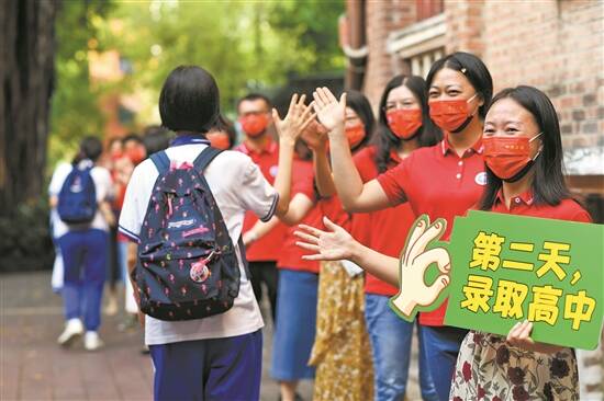 广州市培正中学考点,老师们排成一排,与进入考场的考生击掌,为他们加油 羊城晚报记者 林桂炎 摄 |