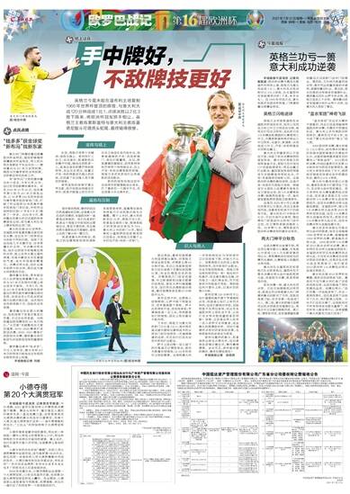 羊城晚报今晨消息 记者刘毅报道:欧洲杯决赛今晨在伦敦温布利球场上演,英格兰与意大利战成1比1,意大利在点球决胜中以3比2获胜,队长基耶利尼举起德劳内杯。自1968年夺冠之后,意大利再次在欧洲