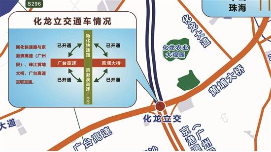 羊城晚报讯 记者严艺文、通讯员广交投报道:羊城晚报记者近日获悉,广州交投集团投资建设的广台高速广州段化龙互通最后四条匝道于7月10日正式开通,标志着该互通全面建成通车。化龙互通建成通车后,可实现新化快速、广澳高速等高快速路之间的交通转换。 化龙互通位于番禺区化龙镇谭山村,是实现广台高速、东二环高速、新化快速、广澳高速交通转换的枢纽型互通。化龙互通共设10条匝道,根据联通高快速路的建设情况分阶段建成,可实现新化快速路与京港澳高速(广州段)、珠江黄埔大桥、广台高速互联互通。 化龙互通全面建成通车后,将有力解决广州东南部高速公路无法与主城区快速联通的问题,促进骨架路网结构性提升,广州往来佛山可节省约30分钟。同时进一步优化番禺莲花湾片区交通基础设施,有效提高沿线居民出行效率。 链接 化龙互通可实现多条高快速路交通转换: ●中山、珠海往来广州市区:广澳高速—化龙立交—新化快速 ●东莞、深圳往来广州市区:广深沿江高速—黄埔大桥/南沙大桥—化龙立交—新化快速 ●佛山、江门往来广州市区:广台高速(佛山段)—广台高速(广州段)—化龙立交—新化快速