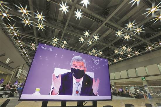 昨天,国际奥委会第138次全会在东京举行,经投票表决后,同意在“更快、更高、更强”的奥林匹克格言后加入“更团结”。图为东京奥运主新闻中心播放的全会画面 图/视觉中国 |