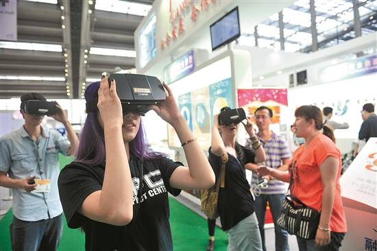 在深圳文博会上,观众通过VR眼镜参观羊城创意产业园 羊城晚报记者 王磊 摄 |