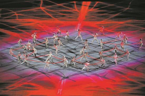 开幕式表演者手持交织的红线,象征着人们在疫情下复杂而纠结的心情 羊城晚报特派东京记者 汤铭明 摄 |