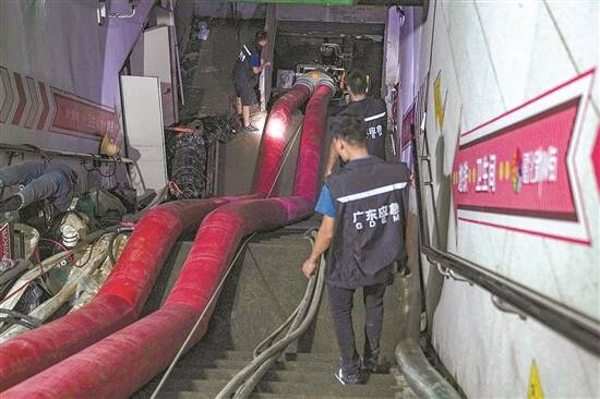 文/羊城晚报特派河南记者 李钢 图/羊城晚报特派河南记者 周巍 24日晚9时30分,随着一声“龙吸水子母3000开泵”的指令下达,抵达郑州的广东支援河南救灾抢险队(以下简称“救灾抢险队”)开始进行抽排水工作。 羊城晚报记者在郑州市二七区德化新街地下商场工作点看到,在队员们完成前期准备工作后,救灾抢险队带来的大型排水装备“龙吸水”发出轰鸣,将地下商场内的积水源源不断地排至地面。据了解,地下商场的积水最深处有7米左右。 由广东省应急管理厅调集深圳、佛山、韶关、清远4支应急救援队共56人组成的救灾抢险队,24日抵达河南救灾抢险一线,所携设备的排涝能力达到了15400立方米/小时。其中,俗称“龙吸水”的大功率水泵,是目前国内排涝最好的设备之一。 记者在现场了解到,德化新街工作点部署的“龙吸水”设备属于深圳市大鹏新区应急管理局。带队的韩伟向记者介绍说,抵达抽排现场后,首先进行了杂物清理、管路布置等工作,为开展抽排工作做好准备。 韩伟说,地下商场的台阶坡度较大,接近“龙吸水”子车的行走极限,而台阶上的积水让子车打滑,因此使用了一些沙包以增加摩擦力。 据广东省应急管理厅应急支援处副处长陈正亮介绍,24日下午4时许,救灾抢险队先遣部队抵达郑州后,接到了很多求助信息;筛选信息后,最终决定先期在三个地方开展抽排工作。 陈正亮说,目前确定的三个工作点都是抽排任务较重的地方,按照当地现有的抽排能力,需要相当长时间才能将积水排完。因此,救灾抢险队根据设备的特点进行了部署。其中,在德化新街这一工作点,部署了“龙吸水子母3000”抽排设备,可行进至地下商场进行排水;而另外两个工作点位于郑东新区,为居民小区的地下车库,部署了抽排能力达6000立方米/小时的设备。根据初步估计,三个工作点的抽排工作大约需要两天时间完成。