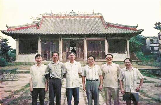 上世纪90年代,众友人在广州黄埔南海神庙前留影。右起:刘斯翰、区潜云、刘斯奋、陈永正、李筱孙、梁守中 |