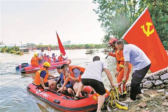 25日,新乡市,救援队冲锋舟深入一线抢救,党员带头
