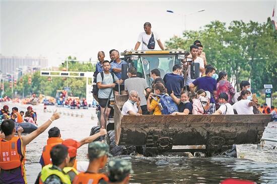 26日,新乡卫辉,受灾群众坐铲车转移,犹如生命之舟