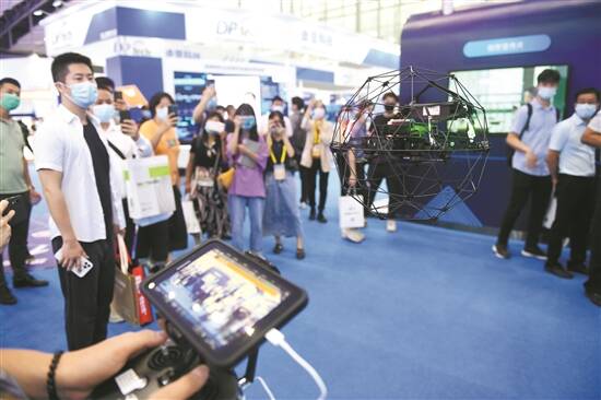 世界安防博览会上展示的室内高空安检无人机 羊城晚报记者 林桂炎 实习生 张子澄 摄 |