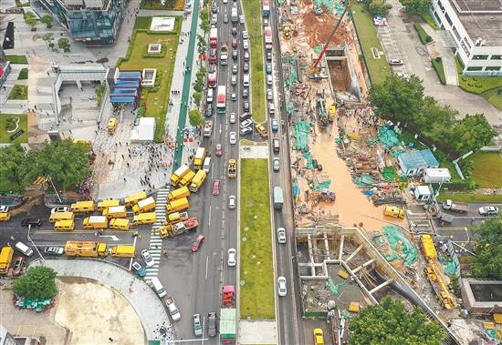 羊城晚报记者 徐振天 梁怿韬 严艺文 实习生 潘雅颖 7月30日中午,暴雨带来的积水冲垮了广州地铁21号线神舟路站在建出入口的挡水墙,涌入站厅、站台,导致线路部分区段暂停运营。经过近6个小时的抢修,截至当天19时30分,包括神舟路站在内的21号线全线各站均恢复正常运营。 “挡水墙不防水,墙面出现了缝隙,水从墙中渗漏了出来。”30日,参与现场抢修工作的技术人员向羊城晚报记者提出疑问称,遭遇暴雨后,工地里的积水大量集聚在地势较低的在建出入口附近,而挡水墙的强度似乎不足以完全阻挡积水。 暴雨积水涌入地铁站 “因积水进入车站,神舟路站暂停服务,列车在神舟路站双向不停站通过。”7月30日13时许,一则紧急通报在广州地铁21号线各车站内播报。听到车厢广播后,从员村站坐地铁经过神舟路站的小林(化名)还没反应过来,就发现列车正在减速,最终不停站通过。她回忆:“经过神舟路站的时候,我看到黄色的泥水缓慢从台阶流到站台,积水大概有几厘米的厚度,站台上空荡荡的。当时我心里‘咯噔’一下,直到安全抵达才放下心来。”小林从苏元站出站时,站外已有地铁工作人员挂出通知:“黄村至苏元已启动公交接驳,请按指引乘坐免费公交车,有急事的乘客请换乘其他交通工具。” 30日16时许,记者从广州公交集团获悉,该集团接到故障报告后紧急启动地铁应急公交接驳,共安排26辆公交车前往黄村站、苏元站进行接驳。另一边,在距离神舟路站两站之遥的黄村站,其靠近大观南路的出入口挤满了等候应急接驳公交的乘客,暴雨带来的积水导致附近出现拥堵。 13时30分左右,家住神舟路站附近的吴小姐正准备坐地铁去往越秀区,在地铁站B口被工作人员告知“站内浸水了”,工作人员和安保人员在出入口拉起了警戒线,耐心劝返试图进入地铁站的乘客。随后,她翻看手机微信群才发现,群里早已传开神舟路地铁站大面积浸水的视频和照片了。 在部分亲历者的手机镜头中,约3厘米深的泥水在站厅内翻涌,站厅一侧,有泥水从位于北面未开通出入口的砖墙缝隙中渗进站内。在持续的暴雨压力下,砖墙最终垮塌,站外的积水冲破神舟路站的最后一道防线,疯狂涌入站厅。此时,候车站台流淌着数厘米深的积水。 抢险6小时全线恢复正常 “大的抽水机下不去,现场用了8台小抽水机排水。”15时许,50余名抢险人员匆匆地进入神舟路站B口。一位参与抢险的工作人员告诉记者:“站内正在加紧排水。相比A口,B口的积水情况比较严重。抢险人员接到通知后立即赶往现场,经过约两小时的排水,站内积水已排剩1到2公分深,准备清洁卫生。” 15时许,在神舟路站B出口,黄埔区应急管理局副局长谷林告诉记者称:“地铁站内部已经加固挡板及沙包,减缓积水对地铁的影响,现正在对地铁站进行清洁,地面没有明显的积水。”他表示,接报突发情况后,黄埔区三防指挥部、区应急管理局、区公安分局、区水务局、区消防大队、街道等相关单位赶赴现场,区科城排水公司救援队、多钛克救援队、街道抢险救援队在现场排水。 半小时后,广州地铁发布通告称:“目前,神舟路站正在进行站内清洁和设备检查。此前,乘客已全部安全疏散,没有发生人员伤亡。” 而羊城晚报记者通过航拍监控获悉,14时30分左右,有身着广州地铁工装的人员被人背出,该名工作人员的其中一只脚上缠有白色的医用绷带。 经过近6个小时的紧急抢修,30日19时30分许,广州地铁最新通报称,早前因神舟路站浸水导致部分区段暂停运营的广州地铁21号线,员村、增城广场双向恢复通车,行车间隔正在调整,全线各站已恢复正常运营服务。地铁站的现场工作人员透露:“神舟路A口通了,B口仍在检修中。” 积水冲垮在建出入口挡水墙 截至30日20时30分,神舟路站的浸水事故已经抢险完毕,但公众仍然不解:尽管暴雨造成周边路面积水,但地铁站内为何会突然涌入大量泥水?按照黄埔区应急管理局现场工作人员的说法:“初步原因为,地铁出入口施工令挡水墙倒塌,排水系统不畅,导致水浸入地铁站点。”广州地铁的通告也表示:“正在施工的预留出入口地面挡水墙小面积倒塌,地面积水通过通道涌入车站。” 前述应急管理局工作人员进一步解释称,倒塌的是水泥砖墙,高约1.2米:“(挡水墙)是被积水冲垮的,但导致倒塌的可能性还有很多,如其本身是否坚固等。目前,经过现场勘察发现,另有一侧墙面也出现了裂缝。” “当时现场应该是形成了类似‘堰塞湖’,挡的不仅是一般的水位,还有积水冲击下的局部涌高水位。”在建新出入口的工地前,一位参与了现场抢修工作、不愿留名的技术人员对挡水墙的质量问题及工程监管表示关注。他向羊城晚报记者透露,遭遇暴雨后,工地里的积水大量集聚在地势较低的新建出入口附近,挡水墙的强度远远不足以完全阻挡:“挡水墙不防水,墙中出现了缝隙,水从其中渗漏了出来。” 神舟路站浸水事件发生后,羊城晚报记者通过航拍画面看到,彼时,不断有泥水从神舟路站北侧的在建新出入口涌入站内。在泥水的持续冲击下,高约1米、本该起到阻挡积水渗入站内作用的水泥墙整体断裂,积蓄已久的泥水越过水泥墙断裂的边沿,飞流直下、源源不断。