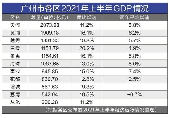 羊城晚报讯 记者罗仕报道:广州市各区近日陆续公布了今年上半年经济运行情况。记者梳理各区情况了解到,天河、黄埔、越秀、白云GDP总量分列前四,白云、增城、黄埔、番禺GDP同比增速位居前列。 GDP总量 白云以微弱优势超越番禺 今年以来,广州统筹推进疫情防控和经济社会发展,上半年经济运行在稳中向好中呈现出“固稳、提质”的特点。根据广东省地区生产总值统一核算结果,2021年上半年,广州市GDP为13101.89亿元,同比增长13.7%,两年平均增长5.2%。 2021年上半年广州市各区经济运行情况如何,交出了一份怎样的发展答卷?记者梳理各区上半年经济运行情况了解到,从GDP总量来看,天河(2873.83亿元)、黄埔(1909.18亿元)、越秀(1831.33亿元)、白云(1158.79亿元)分列前四。 相比2020年广州各区GDP总量排名,记者对比发现,在2020年被番禺超越后,白云在2021年上半年凭借20.2%全市第一的同比增速,以微弱优势赶超番禺,总量位居全市第四位;增城凭借19.3%的同比增速,超越今年上半年受疫情冲击较大的荔湾,排名全市第九位。 GDP增速 南沙两年平均增速第一 2020年上半年,受新冠肺炎疫情影响,广州市及各区经济发展受到冲击,在2021年上半年,广州市各区GDP均取得了两位数同比增速。 其中,2021年上半年白云(20.2%)、增城(19.3%)、黄埔(16.1%)、番禺(16.1%)、南沙(15.0% )GDP同比增速居前,高于广州市上半年同比增速(13.7%)。海珠(13.0%)、花都(12.8%)、天河 (11.2%)、从化(11.2%)、越秀(10.8%)、荔湾(10.5%)低于广州市上半年同比增速。 与往年公开的经济运行数据相比,今年广州市新增了“两年平均增速”指标,这一指标以2019年相应同期数为基数,采用几何平均的方法计算,能更客观准确地反映经济运行情况。 记者了解到,广州多区在2021年上半年经济运行情况中公布了“两年平均增速”情况。其中,南沙(7.4%)、黄埔(6.2%)、天河(5.8%)、番禺(5.8%)、越秀(5.7%)两年平均增速位居全市前列。