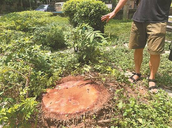 小区有着20多年树龄的大王椰树被锯断,只留下树根 |