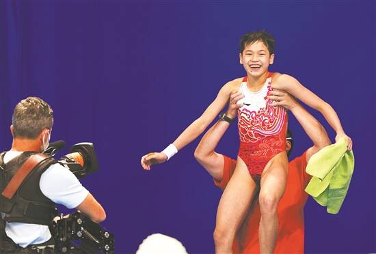 赛后采访时,全红婵被教练高高举过头顶庆祝 新华社发 |