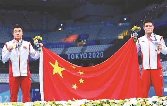 8月7日,中国选手曹缘(左)和杨健在颁奖仪式后 新华社发