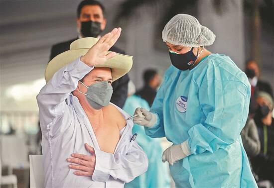 据新华社电 秘鲁总统卡斯蒂略6日在首都利马接种中国国药集团研发的新冠疫苗。 卡斯蒂略和夫人当日上午来到位于利马一处社区公园的新冠疫苗接种点,医护人员为卡斯蒂略夫妇先后接种中国国药疫苗。 卡斯蒂略接种疫苗后对当地媒体表示,他选择接种中国国药疫苗是因为对中国疫苗有信心。他表示,全力推进新冠疫苗接种进度是秘鲁政府当前的工作重点,民众应尽快接种疫苗以保障健康。 秘鲁卫生部长塞瓦略斯同日对媒体表示,卡斯蒂略总统接种中国国药疫苗向全国做出了很好的表率。中国国药疫苗具有高度的有效性和安全性,尤其是在预防重症和死亡风险方面效果明显。 塞瓦略斯说,目前秘鲁3300万人口中仅有570万人完成两剂疫苗接种,秘鲁将全力加快接种进度,争取在9月份实现1350万人完成接种的目标。 秘鲁卫生部公布的最新统计数据显示,该国累计新冠确诊病例超过212万例,累计死亡病例196760例。