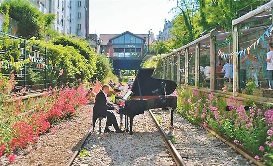 钢琴家在废旧铁路上演奏,这是巴黎旧车站改造的居民公共活动区 |
