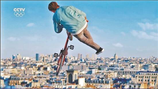 小轮车队队员从屋顶腾空而起,远处是巴黎天际线 |