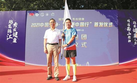 钟南山院士(左)为南山跑团队长周志辉授旗 |