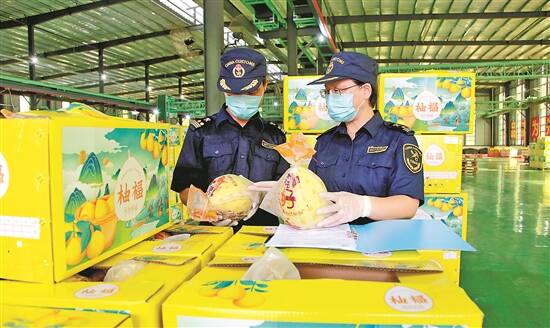 羊城晚报讯 记者危健峰、通讯员胡瑞摄影报道:记者从梅州海关获悉,8月13日,经汕头海关所属梅州海关检疫监管合格,广东顺兴种养股份有限公司20.27吨蜜柚将飘洋过海,摆上美国洛杉矶各大商超货架。这也是梅州柚果继欧盟后进入的又一国外市场。 梅州已成功创建了以梅州蜜柚为主导产业的1个国家级、3个省级现代农业产业园和1个国家级产业集群,蜜柚成为梅州实现农民增收致富,推动乡村振兴的重点产业。 2020年4月海关总署发布第59号公告,允许符合要求的中国柚果出口美国,这对梅州蜜柚开拓海外市场,提升产品竞争力,具有积极意义。汕头海关动植处联合梅州海关提前做好政策辅导和技术支持,帮助企业做好输美准备。“为确保首批输美蜜柚获得市场青睐,我们从果园种植、日常管理,再到采摘、包装、运输等环节实行全流程防疫把控。”广东顺兴种养有限公司负责人张满娟介绍,从去年起,该企业进一步加强果园和包装厂管理,从种植过程中有害生物防治和溯源管理,到柚果选取和加工包装,企业都严格按照相关检疫要求开展,务求做到标准化、规范化,为梅州蜜柚顺利输美做足准备。 “首批蜜柚通过检疫监管顺利出口让我们信心更足。”张满娟介绍,目前公司已陆续收到1000多吨的输美订单,将借此契机进一步拓展国外市场、做大总量,带动农户增收和产业发展。