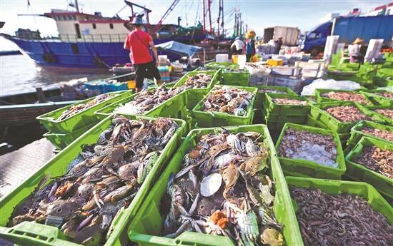 21日,在海南省文昌市清澜渔港码头,大批海鲜从渔船卸下 新华社 发