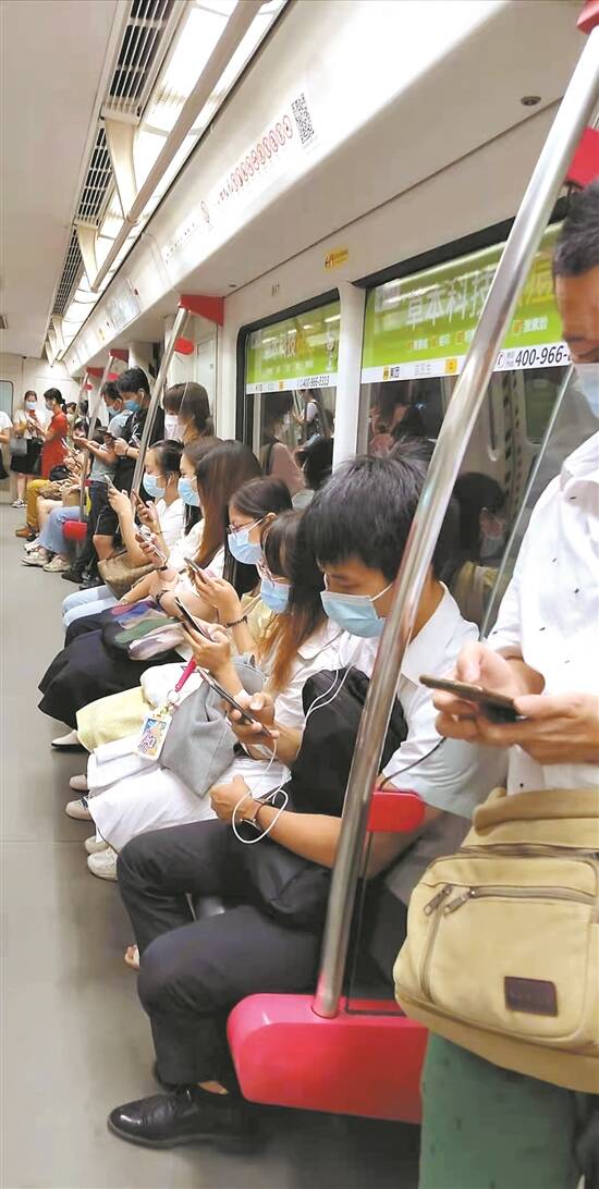 8月18日晚上七时多,广州地铁5号线某车厢。归家的人群中,或坐或站,除了两对母子依偎在一起,其他所有人都全神贯注地盯着自己的手机。
