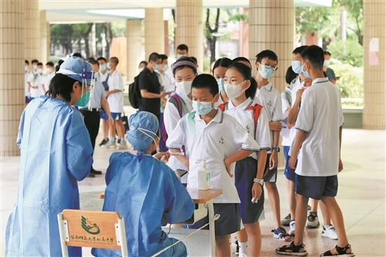 27日,广州中小学启动开学前的核酸采样,各区组织中小学生分批返校检测,为新学期开学筑牢校园防疫安全墙。图为当日上午华师附中师生进行大规模核酸检测 羊城晚报记者 林桂炎 蒋隽 摄影报道