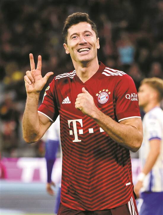 羊城晚报今晨消息 记者徐扬扬报道:德甲第三轮今晨战罢七场,拜仁慕尼黑主场以5比0狂扫柏林赫塔,新赛季2胜1平积7分,因净胜球少勒沃库森1个而位列积分榜次席。 拜仁首轮做客以1比1战平门兴,新帅纳格尔斯曼首战未能取得开门红。不过他很快调整队伍,拜仁的状态也渐入佳境,先是在超级杯以3比1击败“老冤家”多特蒙德,继而在德甲第二轮以3比2力克科隆,在德国杯以12比0狂扫低级别的弱旅不来梅SV,状态走势一路向上,因而狂扫柏林赫塔并不让人意外。第6分钟,老将穆勒就替拜仁首开记录。此后,莱万多夫斯基(上图,新华社发)更上演帽子戏法,至此代表拜仁上阵333次、射入301球,是拜仁队史第二位进球数破300大关的,仅次于射入566球的盖德·穆勒。 18岁的拜仁小将穆夏拉射入第三球。本赛季各项赛事已为拜仁射入2球、助攻1次。拜仁老将、新人齐齐爆发也彰显了纳格尔斯曼的执教能力。