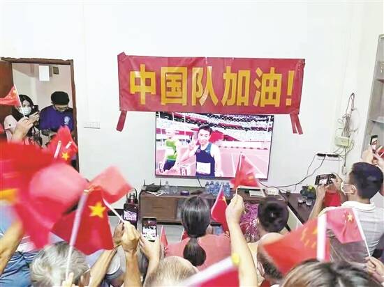 邓培程家人及亲友在电视机前为其加油 陈慧明 摄 |