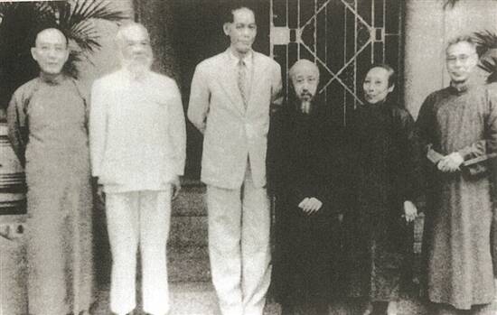 香港民主人士关注内地局势,保持密切联系。图为1948年民主人士在蔡廷锴寓所前的合影。左起:郭沫若、谭平山、蔡廷锴、沈钧儒、何香凝、马叙伦 |