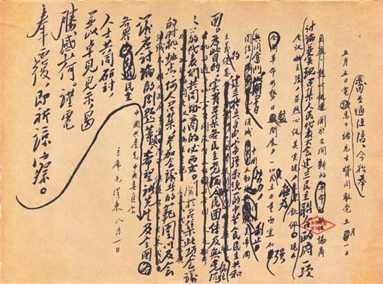1948年8月1日,毛泽东对12位民主人士联名通电的复电文稿 |