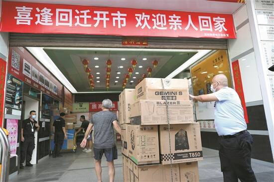 今早,商户拉着货物回迁深圳赛格广场大厦 羊城晚报记者 王磊 摄 |