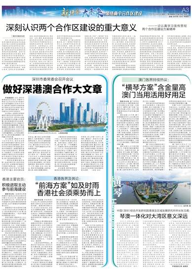 □南方日报评论员 近日,中共中央、国务院公开发布《横琴粤澳深度合作区建设总体方案》《全面深化前海深港现代服务业合作区改革开放方案》,就支持横琴粤澳深度合作区发展、推动前海合作区全面深化改
