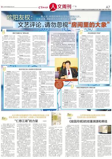 □文/羊城晚报记者 孙磊 8月15日羊城晚报推出“新文艺评论”专题讨论以来,多位专家学者纷纷发表看法。新文艺评论也是在新的媒介语境下的文艺评论:4亿多读者,1000多万写手,2800多万部作品,日益走向世界……经过二十多年的发展,中国网络文艺已成为不容忽视的“房间里的大象”。 除了网络文学,网络音乐、网络动漫、网络游戏、网络综艺等日益发展壮大,与此同时,还产生了许多值得关注的新现象。评论家该如何有效介入?网络文艺评论是否已经形成行之有效的理论体系和评价标准? 针对以上问题,近日羊城晚报记者专访了中南大学文学院教授、中国文艺理论学会网络文学研究分会会长欧阳友权—— 整顿“饭圈文化”很有必要 羊城晚报:目前在大力整顿“饭圈文化”,作为一名网络文学评论家,您如何看待网上的饭圈、打榜、直播等现象? 欧阳友权:我觉得整顿还是很有必要的。这么多年来,网络文艺处在一个野蛮生长的状态,它需要规范。一方面网络文艺涉及的人数多,关系到青少年的健康成长问题,尤其是青少年世界观、价值观的建立。一个不健康的圈子,对青少年的身心成长是不利的,对于整个社会文化建设来说也是不利的,所以整顿“饭圈”很有必要。 羊城晚报:在这种整顿和治理中,网络文艺评论家们可以发挥哪些作用? 欧阳友权:我们作为网络文艺评论家,应该积极发声,站在一个正确的立场上,坚持正确的价值观,对于错误的、不健康的东西要提出鲜明的批评。但主要还是一个引导的问题,尤其是对一些年轻的粉丝。 早期网络文学也经历过野蛮生长的时期,后来采取了一些措施来引导其发展,你看现在网络文学整体来说就比较干净了,基本没有暴力、血腥、情色等内容。 当然,最重要的是思想观念要转变过来,这个过程需要引导,一个是舆论的引导,一个是观念的引导,还有理论上的建构,这都需要一个过程,需要网络文艺评论界的研究者,特别是学院派的职业评论家,积极上网发声,引导网民在网上形成一个正确的评论风气。 羊城晚报:在这个过程里,也有人担心会不会影响网络文艺的活力? 欧阳友权:之前我们做过一个网文行业调研,问卷调查了100多位网络文学“大神”,他们也反映了这个问题,对于网络文艺的整顿很有必要,但是也需要给写作者必要的创作空间。比如一句“黑夜总会过去”无法过审,因为里面有“夜总会”三个字,这不是闹笑话吗? 既要坚持正确导向,又不能过了头,尤其是网络文学,设置太多的敏感词会导致很多网络作家很多东西没法写,读者的阅读体验也不好。 文学是人学,生老病死、七情六欲,才是一个真实的人物,如果把这部分都去掉了,那文学又重新走到公式化、概念化、脸谱化的道路上,网络文学的路子也会越走越窄,所以还是要把握度。 主要是从宏观上把握,在大的原则、价值观、社会效益、社会影响等方面,避免网络文艺走偏方向。同时,在大原则之下,还是要给网络文学包括网络艺术的创作者多一点自由发挥的空间,这样的文学艺术才会丰富多彩。 技术只是工具,无法取代文艺评论家 羊城晚报:“饭圈文化”也在网络文艺评论研究的范围内吗? 欧阳友权:当然,这也是属于网络文艺评论中的一部分。所谓网络文艺评论,包含两个层次的内容,广义层面就是指所有的有关网络文艺的评论,这个评论可以是线上的评论或自媒体的评论,也包括线下的,在传统媒体中的相关评论;狭义层面就是指线上的有关网络文艺问题的评论,大多数的网络文艺评论还是健康的,不能笼统地都否定掉。 羊城晚报:当下网络文艺体量非常庞大,网络文艺评论家该如何有效介入,技术会参与进来吗? 欧阳友权:就网络文学作品来说,确实篇幅很长,尤其是类型小说动辄几百万字,上千万字,在这种情况下,作为一个文学评论工作者,是没有捷径可走的,我向来就提倡要“从上网开始,从阅读出发”,不阅读作品是没有发言权的。 评论者首先要读作品,要了解网络文艺生产传播的规律,一开始肯定要花足笨功夫。后面再慢慢总结规律和方法,比如500万字的一部小说,你不需要把每个字都读下来,确实没有那么多的时间和精力,你的眼睛也受不了,你可以挑选10万、20万字精读,其他可以扫读,大致就能了解一个作家的写作特点和水平。 现在网络文艺范围很宽,传统的文艺形式网络上都有,网络音乐、网络影视、网络综艺、网络网游,网络动漫等,面对如此宽广的范围,我觉得可以放到网络文化的范畴中解读,尤其是一些粉丝饭圈等现象,它涉及的主要是青少年文化,把这些作为文化现象研究,更贴近对象实际,也更契合对象的特点。 随着技术的发展,网络文艺还会出现新的艺术形式,也会带来新的研究对象,技术也会成为网络文艺评论的重要助手,尤其是数据的统计。但技术只是一个工具,无法取代文艺评论家的位置,因为价值判断还是要靠人去把握。 羊城晚报:经过二十多年的发展,网络文艺评论发展到今天,有哪些进步和变化? 欧阳友权:我是1999年开始研究网络文艺的,重点在网络文学上。那个时候网络文学的研究非常边缘化,大家都不太重视,觉得网络文学都不算文学,直到今天还有某些传统的作家和资深的评论家对网络文学依旧抱有偏见。 不过偏见慢慢少了,研究的人也越来越多。2004年召开全国首届“网络文学与数字文化”学术研讨会,全国也就找来一二十个人。今年六月举办网
