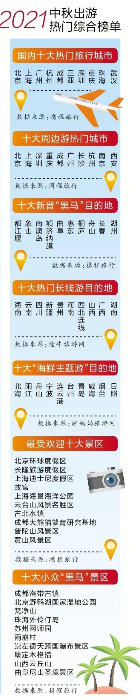 文/羊城晚报记者 刘星彤 跨省游恢复后,国内秋季旅游市场持续升温,在即将到来的中秋小长假,各地游客出游热情稳步提升,旅行赏月,将再次成为首选。 出游预测 3小时以内车程周边游受宠 即将到来的中秋小长假,因暑期出行受限被压抑的休闲度假需求叠加节日探亲需求,旅行市场出现新一轮的客流增长。根据同程旅行、同程旅游发布的《2021中秋小长假旅游趋势报告》,今年中秋假期预计国内出游人次将超8000万。 小长假期间,中心城市至周边市县的汽车、高铁出行需求旺盛。据悉,受放假时长限制,同时有国庆黄金周紧跟其后,近郊周边游成为中秋假期出游的主流选择。根据途牛旅游网预订数据,周边游占中秋出游预订总人次的36%,其中长三角、广东、海南的周边游热度最高。另据驴妈妈旅游网中秋出游预测,3小时以内车程的目的地是游客的主要选择。出游主题方面,夜间乘游船赏月、夜游漫步风情小镇、应季品蟹、采摘以及赏中秋民俗演艺、城市周边的酒店套餐等,均受到家庭游客追捧。 关注热点 赏月文化带动缤纷夜游 休闲度假是中秋节的主要出行场景。据统计,休闲娱乐类景区是今年中秋小长假最热门的景区类型,紧随其后的是自然观光以及主题乐园类景区。 传统赏月文化带动了中秋小长假夜游市场的火爆,据同程旅行数据显示,中秋期间,国内各大目的地、景区夜游关注度均出现增长,其中主题公园夜场、江河夜游、城市夜景观光等项目最受青睐;热门夜游项目包括上海迪士尼乐园夜场、南京夫子庙夜市、重庆两江夜游、苏州网师园夜游、秦淮河画舫等。 据了解,借中秋之机,各地夜间旅游消费供给越发呈现多元化、品质化趋势,众多知名景区推出了特色夜游活动,如:杭州西湖将举办拜月系列活动,以33艘月亮船连续三晚“点亮”西湖夜色;武汉黄鹤楼将在中秋节前恢复夜间演出;北京八达岭长城将被灯火点亮,月色中呈现恢弘气象;在浙江乌镇,主题为“月圆乌镇桥边夜”的中秋活动,将献上书写着乌镇1300年历史的“江南中秋全景图”——在祭月仪式、金秋坊宴、雅集游园会、提灯走桥、船灯树秋等传统活动中,游客可在书院内逛灯会、猜灯谜、行飞花令,还可赏木偶剧,挑选糖画兔子、泥面人、兔儿爷等非遗手作,全身心感受凉风有信、秋月无边…… 大型主题乐园成中秋“爆红”出游热点 亲子游、乐园游成为今年中秋假期两大关键词。 近期,官宣9月20日正式开园的北京环球度假区为“北京游”贡献了极高热度。据多家在线平台数据显示,北京已连续多日稳居热搜城市榜首,预订北京中秋度假产品的人次激增数倍,导致中秋期间北京进出港航班价格明显上涨。而受北京环球度假区热度影响,全国多地大型主题乐园均成为中秋“爆红”出游热点,深度刺激了年轻群体及亲子家庭的乐园消费需求。 据携程方面数据,当前“最受欢迎中秋景区”中,北京环球度假区、长隆旅游度假区、上海迪士尼度假区高居前三,显示大型主题乐园霸榜。 携程研究院行业分析师方泽茜表示,依当前形势,中秋假期有望迎来跨省游复苏的全新拐点。 北京第二外国语学院旅游科学学院副院长邓宁表示,中秋小长假短途、中高端目的地长线游可能成为热点,但同时,跨省游的复苏也将为长线热门目的地打开新的局面。据途牛旅游网统计,中秋国内长线出游人次占半数以上,预测国内长线游市场将在“十一”黄金周迎来新一轮出游高峰。 中秋主题游推荐 主题1 品蟹赏秋、生态采摘 “秋风起,蟹脚黄”。中秋是大闸蟹陆续上市的季节,各类果蔬也进入丰收时节,应季的品蟹游、乡村采摘游成为小长假出游热点。据驴妈妈旅游网统计,阳澄湖、太湖等地周边的度假酒店因推出了丰富的金秋品蟹主题套餐,收获了极高人气;而崇明岛、长兴岛等包含江边骑行、桔园采摘、捉螃蟹等互动体验的亲子套餐产品,也深受家庭游客青睐。 主题2 美丽乡村丰收度假 漫步在美丽乡村的发源地,沉浸于田园风光、自然山水间,体验“住在风景中”的原生态美好,不失为中秋理想的亲子假期。中高端的乡居类型酒店,成为不少城市家庭中秋赏月度假的热门之选。 而据广之旅介绍,适逢9月23日将迎来我国第四个“丰收节”,省内农耕丰收添加中秋民俗元素的乡村文化体验,将进一步丰富假期出游的文化内涵,广州周边(从化、南沙)、江门、东莞、清远、惠州、湛江等地以休闲度假、乡村文化、温泉海滩为主的体验内容,都受到市民欢迎。 主题3 海鲜吃货“贴秋膘” 海滨目的地的“海鲜主题游”,也是每年中秋时节的一大热点。东部沿海开渔以来,部分海滨、海港城市吸引大批游客“为海鲜赴一座城”。 数据显示,今年中秋,我国南部及东部沿海的海滨城市关注度持续走高,除三亚、厦门等老牌海滨目的地城市外,北海、阳江、舟山等地也吸引了大批的“海鲜控”飞赴打卡。 主题4 大美风光、霸气赏秋 多个旅游平台数据显示,中秋期间,小包团、私家定制类旅游产品需求旺盛,其最热衷的长线目的地主要集中在江西婺源、四川西部环线(九寨沟、稻城亚丁)、内蒙古额济纳旗、呼伦贝尔、阿尔山、新疆喀纳斯等以大气风光著称的景观地。 此外,据驴妈妈介绍,作为传统夏秋季旅游的热门目的地,湖南张家界早前因疫情原因暂停开放,积压了部分出游需求,为吸引游客到访,张家界所有A级景区及景区内交通工具在
