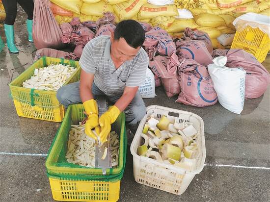 文/图 羊城晚报记者 张文 通讯员 李巧 许丁成 陈志伟 “这是昨天卖生笋的钱,550块!”在韶关市乳源瑶族自治县大布镇的一处竹林边上,曹月华老人满脸笑容,向记者展示自己的收益。初秋时节,正是粤北竹笋收砍的季节,这段时间,当地村民每天上山挖笋。虽然辛苦,却也收获满满。 曹月华说,这个季节,大布竹笋以麻竹笋为主,麻竹笋鲜嫩、爽口、香味浓郁,而且“笋”跟“顺”听起来很相像,非常适合当礼品送人。 大布镇地处粤北山区岭南山脉深处,是“广东大峡谷”所在地,峰峦高耸、谷壑幽深,是典型的石灰岩高寒山区镇,平均海拔600多米,年均气温18.7℃,全年无霜期286天,年均降雨量为1995.6毫米,昼夜温差大等特点,极其适合竹笋的生长。 当地相关负责人表示,大布镇竹笋种植面积逾2万亩,其中麻竹笋种植面积超1万亩,亩产量可达1400至1800公斤。生笋也可以加工成可即食的纯天然鲜笋和笋干,产品受到广大消费者喜爱,2020年大布镇竹笋制品产值达5000万元。 近两年来,大布镇立足实际,通过“专人到点收购”以及“公司+基地+农户”的经营模式,在辖区竹笋种植地设置收购点,帮助种植户解决竹笋销售难题。 “以前农户把笋送到镇上卖,我们向他们收购,一天只能收1000多公斤。现在我们每天安排两趟货车下村收笋,一天最多能收购近5000公斤生笋。”当地一家食品企业负责人周伟明说,直接从农户手中收购鲜笋,既能保证产品品质,又能提高农户利益,“他们负责种植,我们负责销售,价格公开透明,可以实现企业和农户的双赢。” 记者在大布镇钨英村村口的生笋收购点见到文亚华时,他刚获得700元收入。他说自己现在天天在地里挖笋,“一直挖到10月底,预计能有4万块钱左右的收入,比外出打工强多了。我打算明年再扩种10亩,儿子现在在外打工,我准备把他叫回来,和我一起干!” 据了解,为更好地发展当地笋竹产业,大布镇党委、政府目前正积极推进省道S258线鸭麻湖至大布段改造,完成大布至钨英公路路面改造等交通项目,同时积极为各村牵线搭桥,鼓励村集体成立合作社,开展农产品种植技术等培训,助力麻竹笋走上规模化、产业化之路。 与此同时,当地还积极创新生产经营模式,推动土地流转工作,鼓励村民把手中的闲置土地流转出来,进一步优化农业生产要素,发展壮大麻竹笋产业规模,以此促进农业增效、农民增收、农企增量。