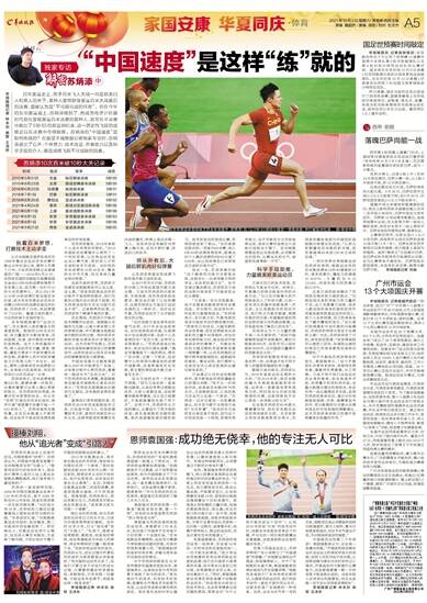 陕西全运会百米决赛夺冠后,苏炳添和他的广东省队教练袁国强一起登上了领奖台。苏炳添把金牌献给袁国强。“我跟教练许下过愿望,这个冠军要送给袁导,他为中国短跑立下了汗马功劳。虽然他没去东京奥运会,