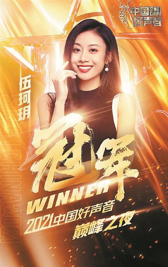 羊城晚报记者 龚卫锋 “好声音”十年之约如期而至。10月15日晚,《2021中国好声音》总决赛在杭州举行。廖昌永战队的陈文非、汪峰战队的姚晓棠、李荣浩战队的王靖雯以及李克勤战队的贺三、伍珂玥在舞台绽放风采。经过三轮比拼,伍珂玥获得本季冠军。 值得一提的是,本季“好声音”五强选手中有两位来自广东——来自台山的伍珂玥和来自汕尾的姚晓棠。决赛前,羊城晚报记者独家专访了23岁的伍珂玥,她说:“我想唱出台山、广东、大湾区的声音。”夺冠后,伍珂玥难掩激动:“从盲选到现在,我经历了很多,有幸成为克勤老师的学生,有幸能拿到这个奖。这真是一个不一样的夏天。” 自小受到粤语歌熏陶 7月30日,伍珂玥在《2021中国好声音》首期节目中登台,一曲《蔓珠莎华》获得8位导师转身。她如此介绍自己:“我的家乡是广东台山,Beyond黄家驹的故乡……” 伍珂玥从小就受粤语歌熏陶,小时候便展露出不俗的歌唱天赋,多次获得校园歌手大赛一等奖。不过,父母并不支持她走音乐这条路。伍珂玥说:“台山的生活节奏慢,父母觉得踏踏实实选择一份稳定工作比较好,因为他们不确定我把金钱和精力投入到音乐上,会不会有回报。” 父母的观望态度让好强的伍珂玥在考大学时更加努力:“我要向他们证明,我对自己的前途很笃定,不会辜负他们,希望他们放心。”凭借着过硬的专业实力,伍珂玥接连通过四川音乐学院、星海音乐学院、深圳大学三所大学的专业考试,她最终选择深圳大学,正式开启逐梦之旅。伍珂玥说:“选择深圳大学,可能也是想给自己留一条后路。万一真像父母所说,音乐这条路我最后走不下去,还可以在学校里结交到不同专业的朋友,打开交际圈,多一点选择。” 大学是个“养成”的过程 考进深圳大学金钟音乐学院后,伍珂玥师从流行演唱专业副教授赵久峰。她称自己是一个“乖学生”:“如果不按照老师的要求来做事,我内心就会很难受。我习惯把事情规划清楚,还会给自己设定一条分数线。”伍珂玥喜欢深圳,也和她的性格有关:“我的目标感很强,做事情需要一些推动力,快节奏的深圳给我带来了冲劲。我哥哥好不容易说服了父母,帮我一路波折走到深圳大学,那我就一定要付出全部努力,向着当歌手这个目标往前冲。” 伍珂玥将大学四年形容为一个“养成”的过程。大一整年,她待在学校苦练专业,没有外出演出:“没有学到东西前,我肯定要先充实自己,绝对不允许自己出去丢脸。”大二她开始踏入社会积累舞台经验,“获得了很多本土音乐人的帮助”。2019年2月,伍珂玥参加了当年央视春晚深圳分会场的演出;2020年,在中央广播电视台总台主办的“逐梦先行”庆祝深圳经济特区建立40周年文艺晚会中,伍珂玥担任开场歌舞节目《这就是深圳》的歌手。 半年前,《2021中国好声音》开启深圳地面海选,伍珂玥通过层层选拔,一路闯进最终试音环节:“每一轮筛选都要经过导演组的重重审核,试完音后,导演会说‘回家等着吧’!很多选手永远接不到下一个电话。我很幸运,每次试音完都能接到下一轮筛选的通知。” 伍珂玥表示,《中国好声音》的筛选机制十分成熟。参加正式比赛前,选手不允许与总导演有任何接触,同时,也收不到选人导演的任何反馈,只能苦等结果。正式进入比赛后,导演摇身一变,成为学员们的“管家”。伍珂玥说:“每位导演都很关照学员的饮食、作息。录制期间学员很辛苦,但导演、工作人员同样辛苦。” 歌迷眼中的“港风美女” 《蔓珠莎华》《海阔天空》《一生中最爱》《假如》《我等到花儿也谢了》……伍珂玥在《2021中国好声音》舞台上演唱了大量粤语歌。她表示,以港乐为代表的粤语歌曾十分辉煌,希望能在舞台上为观众带来回忆,“作为一个广东孩子,我希望在这个舞台上带来台山的声音、广东的声音、大湾区的声音,唱粤语歌会让我更有归属感。” “港风美女歌手”“粤语歌坛接班人”是伍珂玥身上最显眼的标签。她最先被观众认识,是在初舞台演唱了由梅艳芳原唱的粤语金曲《蔓珠莎华》,一曲歌罢赢得八位导师转身。导师李克勤评价:“我要听一下你唱出来会不会很像梅艳芳,发现你很有自己的风格。”播出当晚,伍珂玥就登上微博热搜榜。伍珂玥形容自己当时都懵了:“突然获得如此大的关注,仿佛被上天亲了一下。我做梦都不敢想。” 伍珂玥坦言,被网友称赞为“港风美女”,让她开心不已。她说:“或许因为我长的是广东人的样子,嘴大大的,还爱涂红唇。而且我喜欢唱粤语歌,它们会引发大家对港乐黄金时期的回忆。” 李荣浩也不止一次称赞伍珂玥的台风很“港风”,他更用“大鹏展翅”来形容伍珂玥在动情演唱时大开大合的肢体动作。网友甚至把“大鹏展翅”做成了表情包。伍珂玥说:“表情包很鬼畜、很可爱、很搞笑,我都很喜欢。”在此之前,伍珂玥就知道自己唱歌时会下意识做动作,但在《中国好声音》的舞台,动作有了名字:“我从小就在家看很多香港明星唱歌,可能他们的动作耳濡目染地刻在我的脑海里,以至于当我成年后有机会登台唱歌时,封存在身体里的记忆被唤醒了。” “好声音”夺冠梦想成真 最近几个月,伍珂玥有很多梦想都成了真,比如登上《中国好声音》的舞台,比如与李克勤合唱《红日》。10月9日,在李克勤战队的当期开场秀《红日》播出后,伍珂玥发了一条微博:“我从