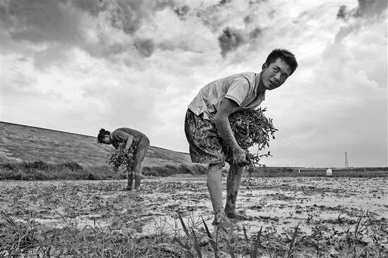 2021年8月3日,佛山市三水区大塘渔民在北江浅滩捞蚬 |