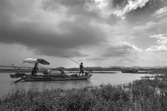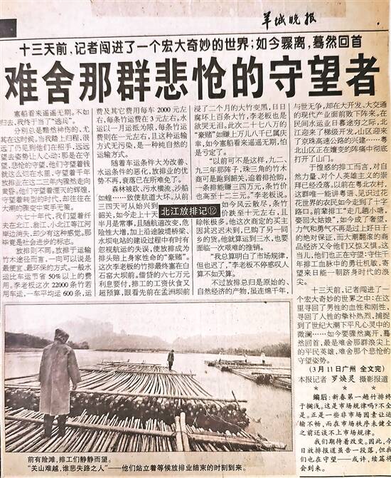 《北江放排记》后记 图/文 罗焕灵 当上记者后,我做的第一件事就是回到我的家乡始兴县。那年是1997年,正月十五元宵一过,报社安排我去采访了始兴县河南乡各类放排的真实情况。在清代中后期,整个北江全是竹排木排,最多一年超过2000条排,有从湖南过来的,也有从江西过来的,由于排太多,只好在现韶关市东河坝设了一个杉木同业公会和毛竹同业公会。 喝过年宵春酒后,我从老家拿了一床破棉被,提了一只老公鸡带了一方大肉,上到排上,向我同学他叔拜了师。带齐了我刚买的一套顶级摄影器材,在十八翦排中选了中间的一翦,专门搭了一座四方透风的竹寮,开始了我的奇特采访生涯。 在北江上游河南乡,多数考不上学参不了军的男丁第一选择是放排。全始兴县最时髦的东西物件也最先出现在河南乡,全县第一部黑白电视彩色电视机、第一部冰箱都是在河南乡出现的。 我从国外新闻摄影的大量图片中悟到了点什么,拍出的图片狂放不拘一格,力度和冲击力十足,既体现了放排工的男性气质,也体现了北江沿岸的水墨山水风情。广州一家著名杂志总编见后大为称许,竟拿我拍摄的排工饱经风雨开裂的手作为杂志封面。 那一条北江千年来“最后的竹排”走走停停十几天,每隔两天,我上岸冲洗黑白和彩色照片,并用传真发回图文稿件,在《羊城晚报》连载了十几天,不仅轰动了整个韶关市,特别是文中提到的何屋村排工在大自然的冲击下雄性坚忍的形象感动了许许多多的人。我对于千年放排业走到了穷途末路时感叹的“关山难越,谁悲失路之人”,也引起许多共鸣。 据说第二年韶关市“两会”期间,一位韶关市人大代表拿着我写的《放排工宁可喝酒不喝江水》的大篇文章,指着始兴县造纸厂废水直排北江的巨幅照片,大声责问始兴县领导…… 结果还是遂了我的愿,始兴县造纸厂被勒令无限期停产,直至彻底解决污水排放为止! 但愿这条河回到儿时的清澈模样,更不用说河上曾经的鱼虾满江、欢乐满江了。 我为什么拍北江? 图/文 潘赣明 我是广东客家人,但出生于江西,1992年到清远佛冈县国营的照相馆上班。从江西到广东清远,正是北江正流的行程。在清远生活,经常看《清远日报》,我们看潘伟老师的作品,特别喜欢他拍摄的乡土风情。近年,受羊晚集团李洁军记者的嘱咐,我开始正式拍摄这条母亲河。 北江,是非常浪漫的一条江。这个浪漫首先就在于它是诗人的河流。韶关的张九龄,北江就是他老家。 还有韩愈,他小时就在韶关生活过。后来被谪,是经从湖南临武,也就是北江北源武水那里南下,走经过连州的古道,然后去的潮州。 张九龄借北江东源,开了梅岭古道,很多诗人,从古道转浈江,走到岭南这边来。比如苏东坡、南宋的杨万里,对这一路写了很多诗,到英德、清远都有写的。还有汤显祖,也经过了清远与英德。 我拍北江,也有个人的因缘。我带我老爸去拍,去走一走散散心,没想到他说他上世纪六十年代曾经在英德这个大站镇,居住过几年。做过砍柴,做篾匠这些农活。在潭洞革命老区这山里面待了三个月,就织箩筐为生,家家户户都要。 有位居民叫陈唐街,55岁,他一见到我老爸就说,哎,你们曾在这里干过活吧?刚好在他家就找到这个猪箩。其实就是簸箕,我爸第一时间就认出来,“是我做的”。那时候他二十来岁,啥都没学过,但是他一学就会,他做的那个箩筐比较笨重,我爸对这件最大的箩就印象特别深,因为那个时候他做手艺不行呢!竹子做得特别厚,所以它能够保存到现在。 我当时就用200块,把那个箩筐买回来做个纪念。 拍北江的故事不是一次能说得完的。我只能说,拍得更多的是新的北江,新与旧的对比,在北江这相对纯朴的地区,是能深深体会到的。知古,见今,我爱我们的北江。