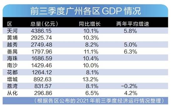 羊城晚报讯 记者罗仕、鄢敏报道:4日下午,广州天河区公布前三季度经济运行数据。至此,广州11个区前三季度GDP数据全部出炉。记者梳理各区情况了解到,天河、黄埔、越秀GDP总量继续领跑,增城、番禺、白云GDP同比增速位居前三。 今年前三季度广州经济运行呈现出“运行平稳、稳中蓄能”的特点。根据广东省地区生产总值统一核算结果,前三季度广州市GDP为20029.12亿元,同比增长9.9%,两年平均增长5.3%。 今年是“十四五”开局之年,前三季度,广州各区交出了一份怎样的发展“成绩单”?记者了解到,从GDP总量来看,天河(4386.15亿元)、黄埔(2925.74亿元)、越秀(2749.48亿元)继续领跑,位于全市第一方阵。 紧随其后的是番禺(1797.96亿元)、白云(1768.55亿元)、海珠(1686.59亿元)。相比今年上半年各区的排名,番禺以微弱优势超越白云,总量排名全市第四。 从GDP同比增速来看,增城(13.2%)、番禺(11.1%)、白云(10.6%)、海珠(10.4%)、黄埔(10.3%)、天河(10.1%)、南沙(10.0%)增速居前,高于广州市前三季度同比增速(9.9%)。