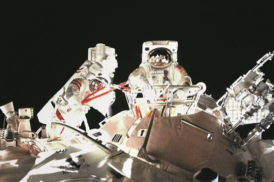 11月8日在北京航天飞行控制中心拍摄的神舟十三号航天员王亚平(右)结束出舱任务 新华社发 |