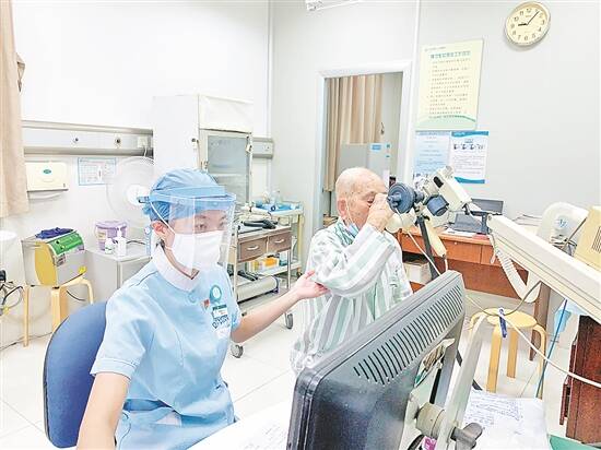 广东省第二人民医院呼吸与危重症科技师及医生给慢阻肺患者进行肺功能检查 图/医院提供 |