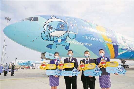 羊城晚报讯 记者唐珩、通讯员南宣报道:第46届世界技能大赛将于明年10月在上海举行。昨日,大赛倒计时300天之际,全球首架世界技能大赛主题彩绘飞机——南航“上海世赛号”在广州正式亮相(见图,羊城晚报记者 林桂炎 摄),并成功首航广州至上海航线。飞机抵达上海虹桥国际机场后,受到了民航业最高礼遇的落地滑行“过水门”迎接。 据了解,“上海世赛号”彩绘飞机由南航与国家人社部、上海世赛执行局合作推出,是南航大国工匠团队与我国世赛金牌选手共同完成的作品。飞机选用国际远程宽体机型(波音777-300ER),采用整机喷漆技术,总喷漆面积3300平方米,相当于7.8个标准篮球场面积,整个喷涂过程历时16天。机身核心图案为象征工匠精神的榫卯,突出“一技之长,能动天下”;中部选取上海及京津冀地区、粤港澳大湾区的城市地标作为核心元素。作为第46届世赛的“空中名片”,未来,“上海世赛号”还将执飞更多航线。